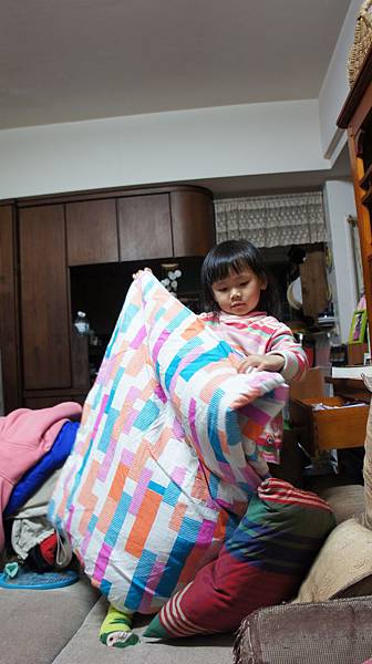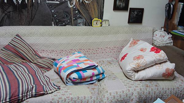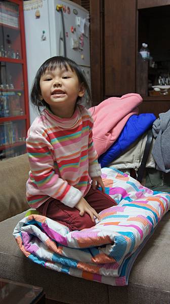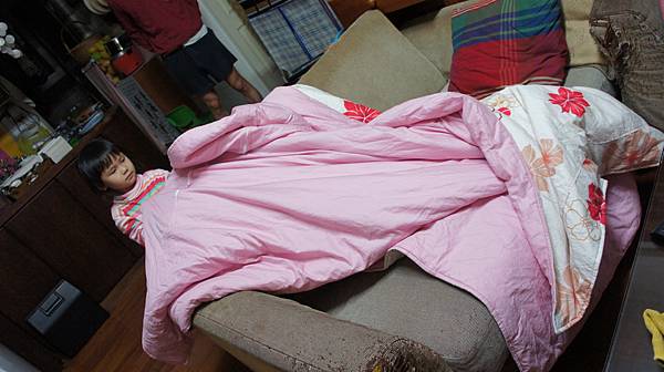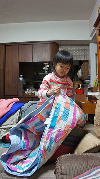 (上圖)折第二件,很大一件哦,她都自己折耶~哇~我家女兒可以嫁人了。(她老媽從不折棉被的。)