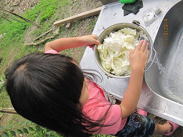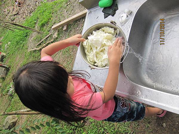 我跟牛牛去洗手台區洗完砧板及菜刀後,便吩咐牛牛自己去洗高麗菜。(因為高麗菜不太需要努力洗,所以...)
