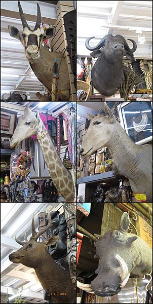 (上圖)牛牛指著牆上的長頸鹿,面對如此近在眼前、活靈活現、有毛的又巨大的標本,我及許靖蘭著實嚇到了。以上是店裡真的標本哦。還有疣豬耶~。