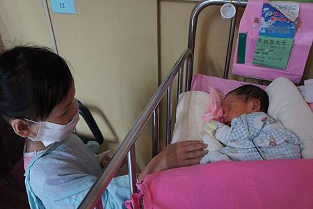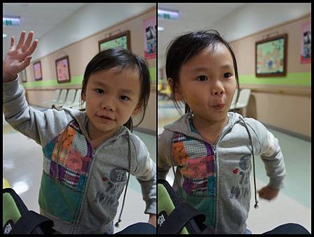 (左上圖)牛牛在熟睡的英愛旁悄悄的說:愛愛,姐姐要送妳很多玩具哦。(右上圖)英愛馬上就睜開眼了耶。