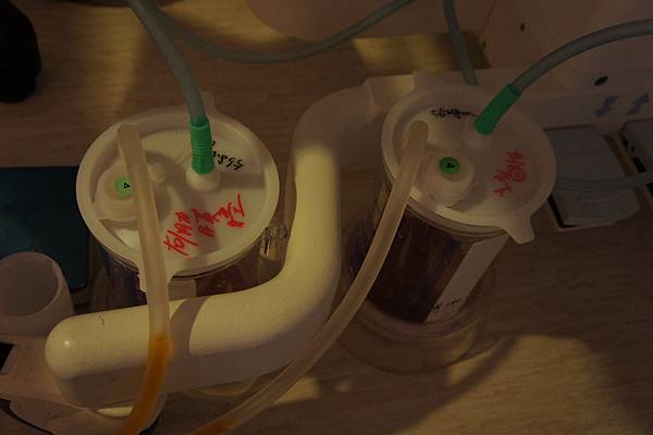 20:00肩膀的靜脈導管拔除(會較不舒服),右腳接一注射導管,因排血水量少了,所以拆除兩條胸管、縫合並照胸部X光。