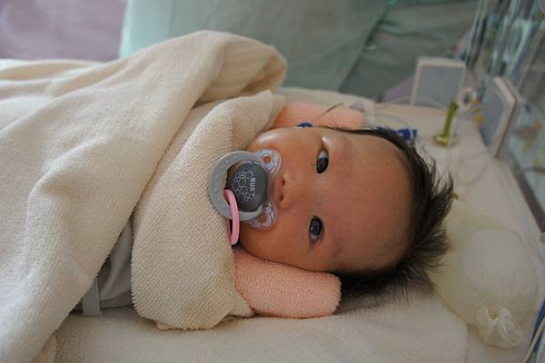 血液含氧量100。 正常人數值為95-100,所以英愛的狀況很好。有些寶寶在加護病房住了兩週,血氧量還僅有80。