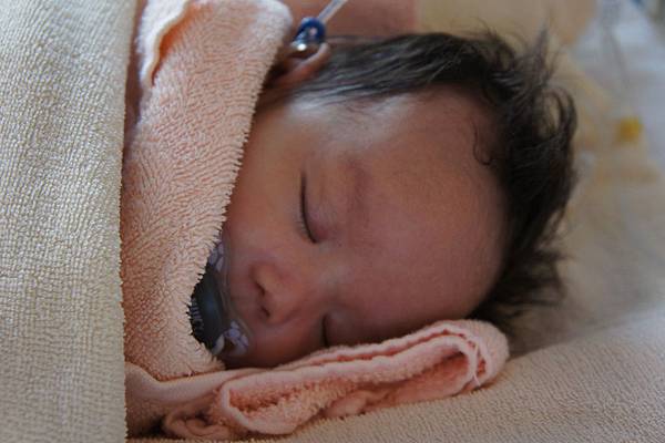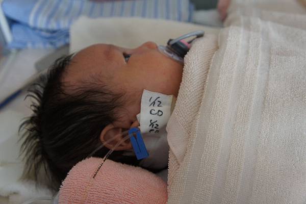 一點都不開心,因為我及阿川哥一走進病房,愛愛的臉腫得像一顆豬頭,眼睛腫得睜不開呈一字形,詢問之下得知是我們到院前愛愛哭得很慘,護理師也詢問我們之前寶寶在家會不會也是這種狀況,我回答:還好!(但實際上她在家時也曾發生過幾次哭到聲嘶力竭,妳懷疑她可能下一刻人就怎麼了,而我沒辦法了,只好跟著她哭。)