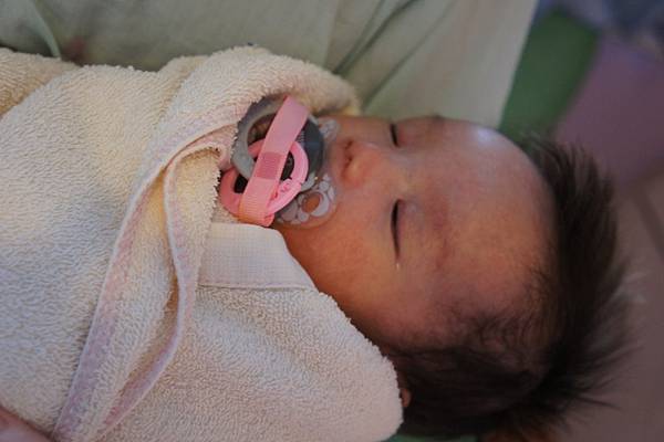 經過一個小時後的愛愛有比較消腫了,也不哭了,睜得開眼了,一直緊握我的手喔。