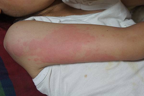 (下圖)昨天又延燒到其它地方,今天更是嚴重,很多親朋好友給予很多意見:打一針就好了、應該要住院到整個康復、發完疹退了約二或三天就可以完全好了、...,不知是哪一個親友說:等全身發完疹才會好,最好的方式是泡冷水澡。