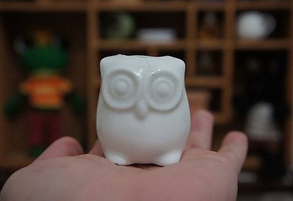 (上圖、下圖)白色瓷器貓頭鷹牙籤罐,應該也十八歲了。
