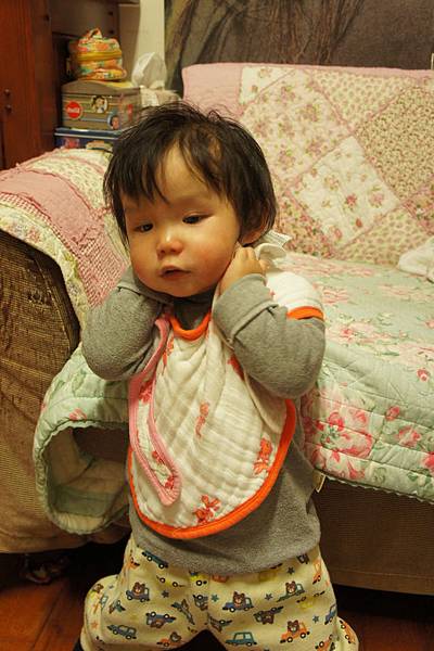 愛愛自己去拿自己的圍兜兜,自己披在自己的脖子上,這也未免太好玩了吧~。