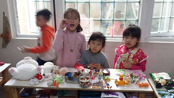 她跟我說:媽媽,我今天是賣最多、生意最好的喔~連老師都跟我買吔~。Patty老師很喜歡我的東西,我就先留給她了喔~(老師,這樣不行喔!)