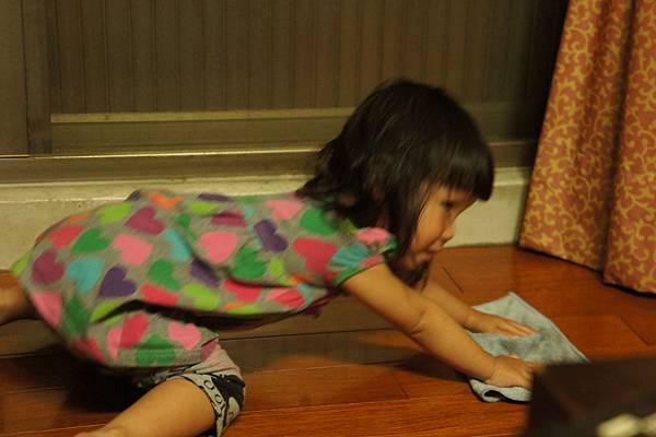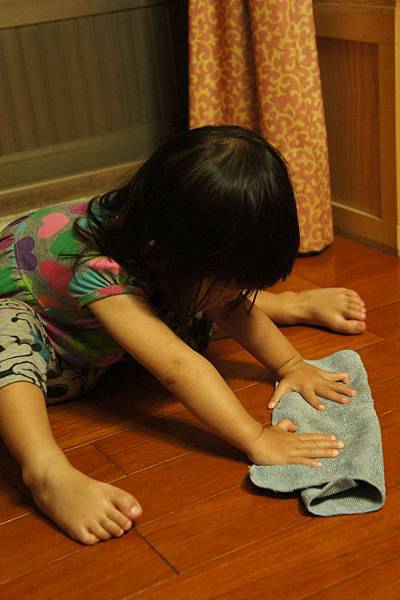 果然是身教是身教啦,沒多久,她又去拿地板布,摺一摺、擦一擦了,好可愛喔~~。