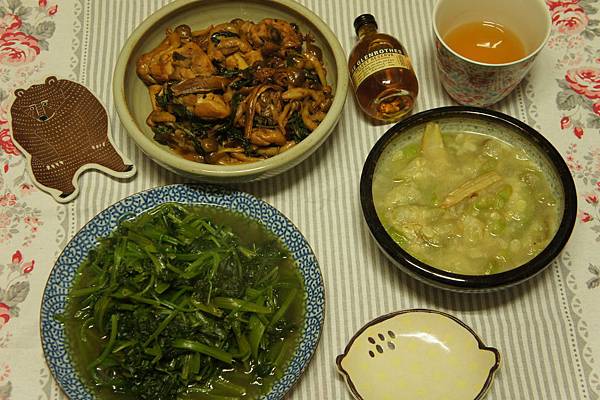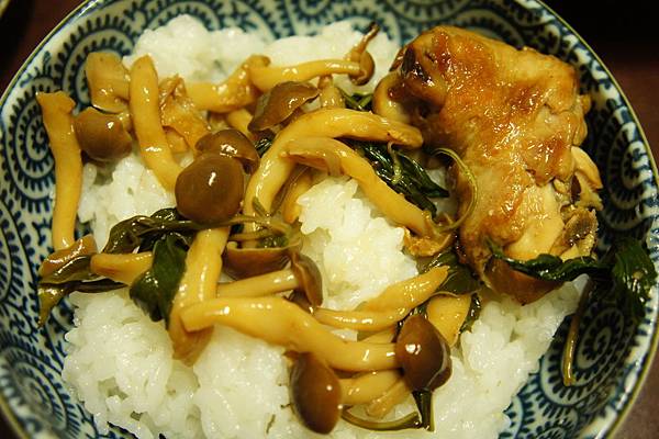 (上圖)今天雞肉買了60元,兩包鴻喜菇70元,九層塔10元,這一頓共花了175元,有點破表。