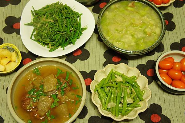 (上圖)今天的排骨酥買了140元,香菜10元,冬瓜19元,四季豆20元,菜瓜煮兩條,共計245元。