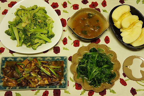(上圖)真的想要煎魚時不要一直噴油,所以今天採用小火慢煎,但肉質好乾喔~相對其它的蔬菜,大家吃的很高興,我只好把自己的失敗之作吃下去了。