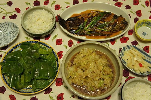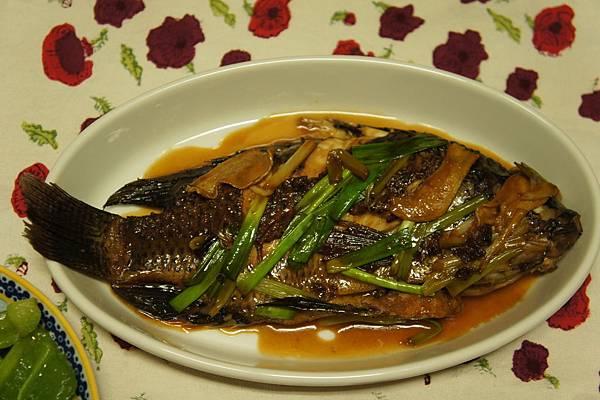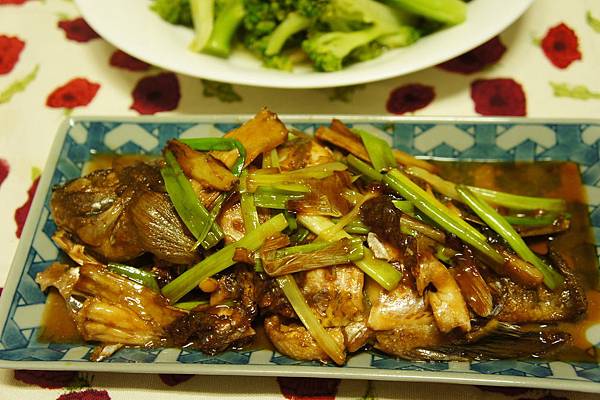 (上圖)哈~哈~哈~失敗的紅燒魚,煎到皮都掀起來,醜死了,只好用蔥及薑來蓋屍體了。
