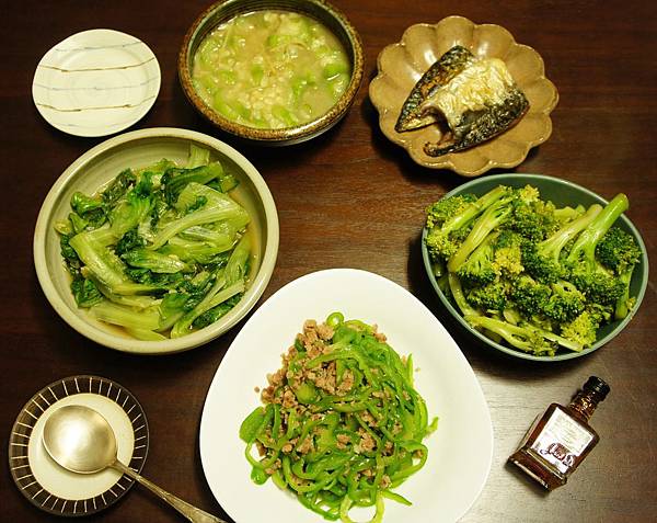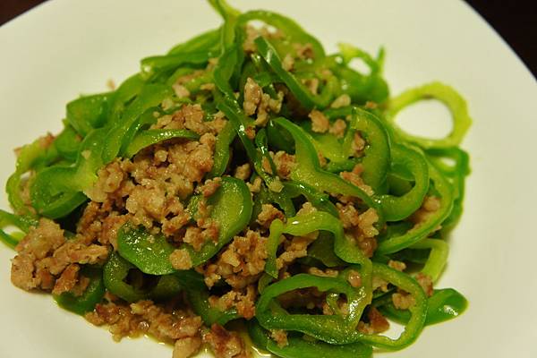 (上圖)為了應付愛醬要吃的肉,可是我今天又沒有去菜市場,所以冰箱的冷凍肉末只好出場了。肉末炒青椒。