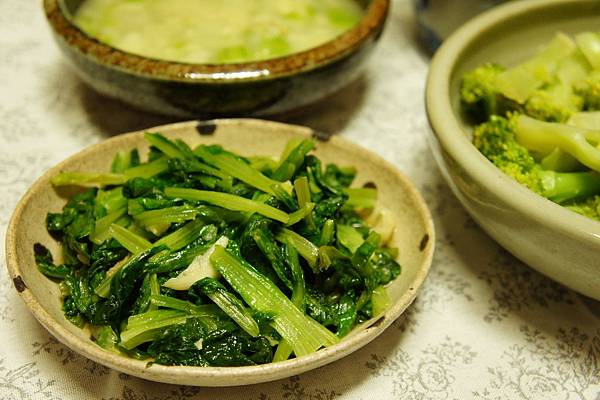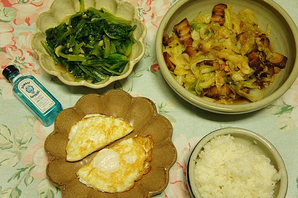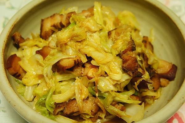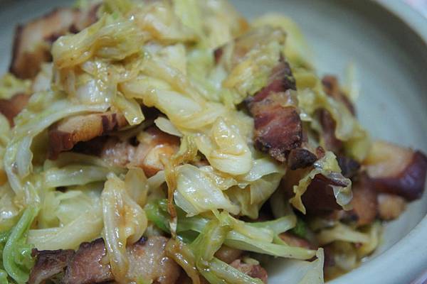(上圖)沒有蒜苗,所以臘肉炒一下高麗菜。好香好勾引人的味蕾,害我吃好多。
