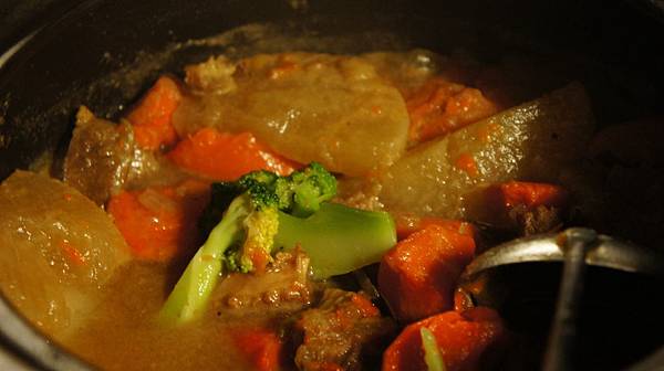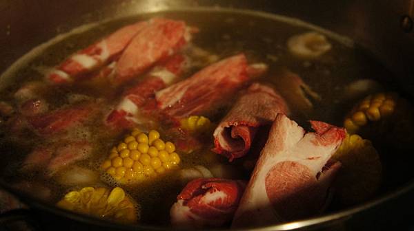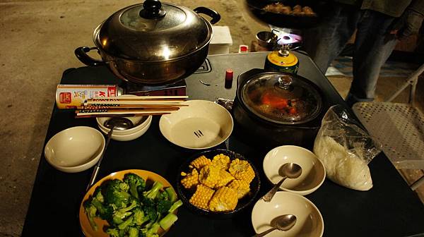 (上圖、下圖)晚餐是我主廚的羊肉豬肉片火鍋、燉牛腩、義式肉丸及清燙甜玉米配飯喔~。