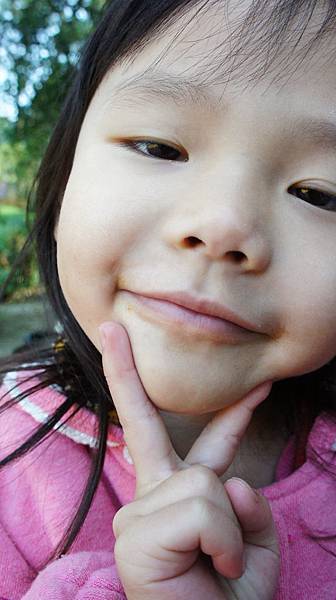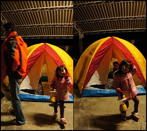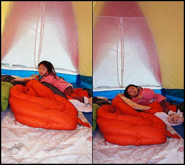(上圖)牛牛消失了,好奇之下,發現她躲在帳篷裡,原來是想她的枕頭了。(還手比著枕頭呢!)